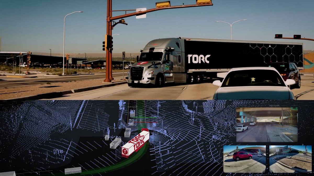 Dieser Baukasten besteht zum einen aus unserer „redundanten Fahrzeugplattform“, dem „Autonomous-Ready“ Freightliner Cascadia, sowie der autonomen Fahrsoftware, dem „Virtual Driver“ von Torc. Hinzu kommt eine physische und digitale Infrastruktur, die aus den beschriebenen Hubs besteht und den autonomen Lkw-Betrieb ermöglicht. Schließlich werden weitere Dienstleistungen wie Reparatur und Wartung sowie Unterstützung rund um den autonomen Lkw-Betrieb benötigt.