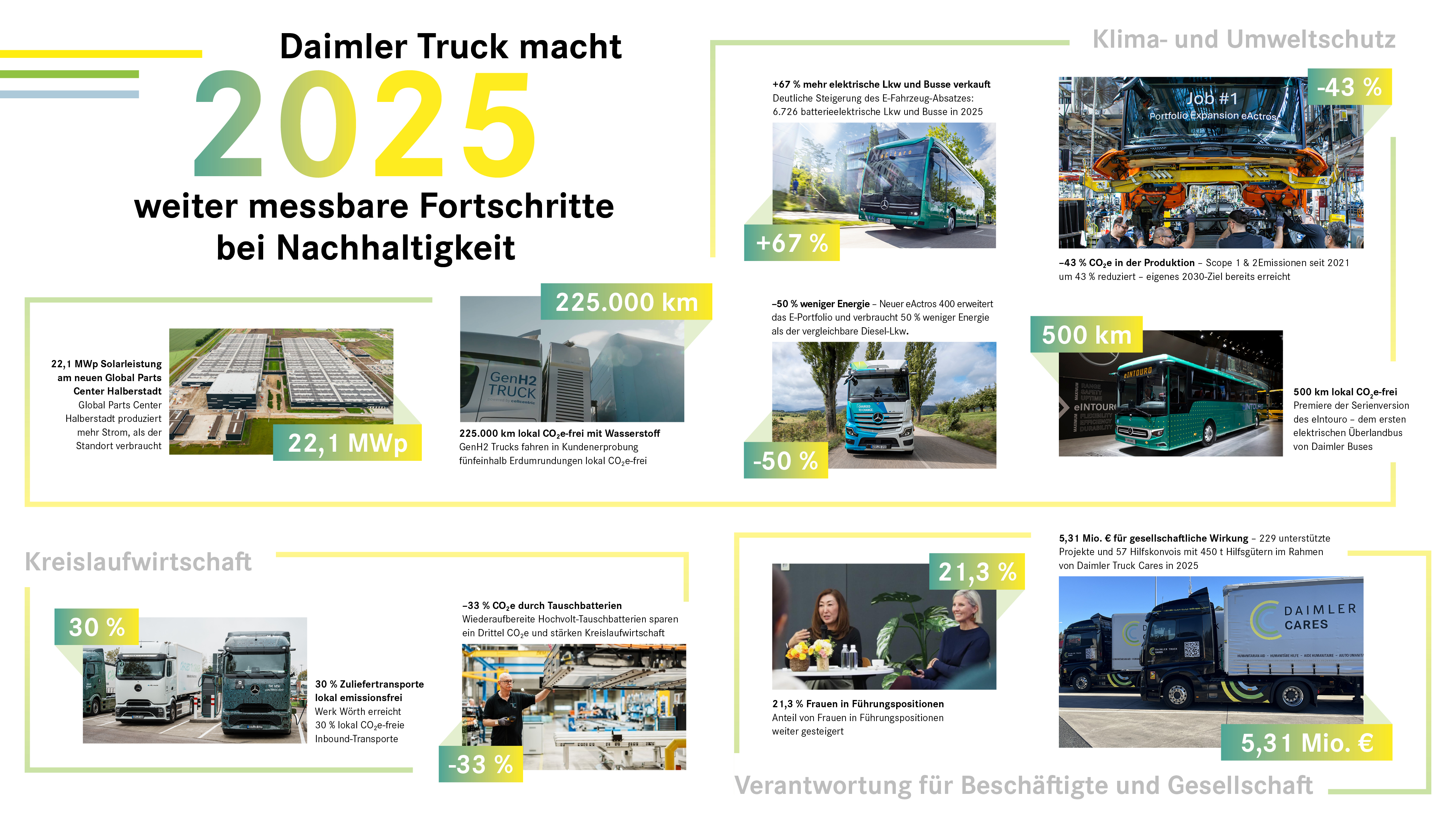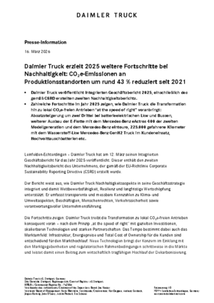 Zudem wurde unser Projekt „Electrify Inbound Logistics“ mit dem Europäischen Transportpreis für Nachhaltigkeit des Magazins “Transport” vom Huss-Verlag ausgezeichnet. Rund 30 % der Transporte in das Lkw-Werk Wörth waren Ende 2025 lokal CO₂e-frei – unter anderem mit Mercedes-Benz eActros 300 / 400 der ersten Modellgeneration und dem neuen Mercedes-Benz eActros 600.